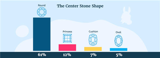 Sixty-one percent of brides choose a round diamond for the main stone. It's timeless and classic, after all. Princess ranked second with 12% of brides rocking these shapes. After that, cushion (7%) and oval (5%) are the next most popular shapes.