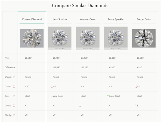Blue Nile has a diamond comparison feature. When you're looking at a specific diamond, you'll see a price and spec comparison chart for other similar diamonds. This can be good to quickly see if there's a better value stone.