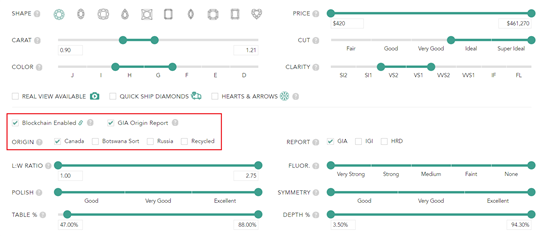 The advanced filter settings let you search for the factors important to you, such as blockchain diamonds, country of origin, and diamond report.