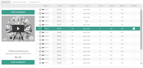 As you go through the list of results, you can see a preview of the diamonds before clicking through to the individual pages.