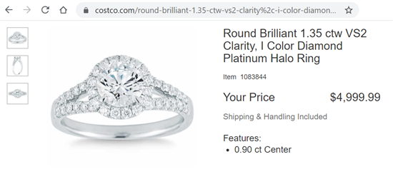 Finally, let's look at this split-shank halo ring from Costco for $5,000. It has a 0.90 carat center diamond, with a total carat weight of 1.35 carat.