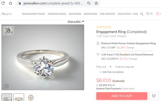 Below, a similar ring from James Allen with a platinum solitaire setting for $1,300. This 1-carat diamond from James Allen costs $4,710. We even upgraded it to an Excellent cut, so it's better quality. In total, creating the same ring on James Allen would cost $6,010.
