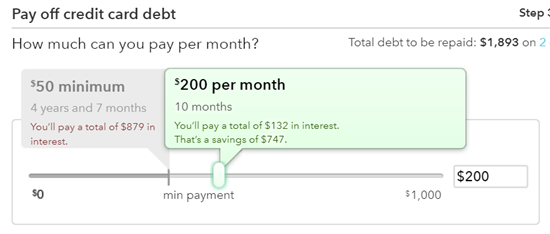 Enter how much you can afford to pay each month. Mint will tell you how long it'll take to pay it off and how much you'll pay in interest. You can play around with the slider to see how different amounts will affect payoff.