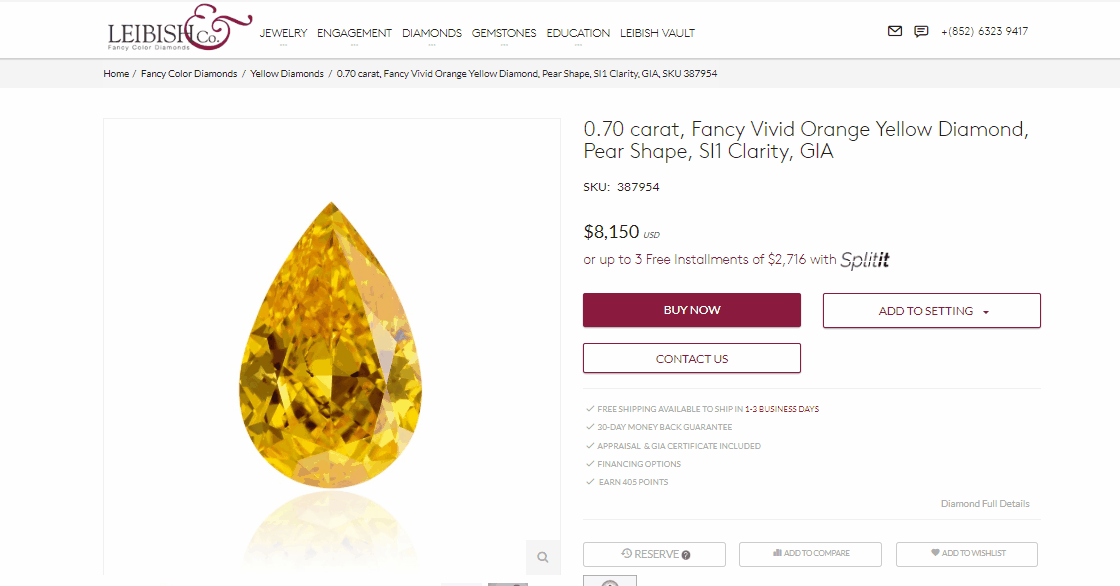 Reserve a stone. Inventory moves fast on Leibish. And because each colored diamond is one-of-a-kind, if you see one you like, you can reserve it for a 10% deposit.[2] You have up to a week to complete the rest of the payment. - Full details of the diamond