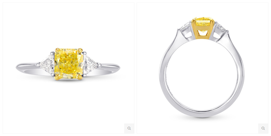 For example, the ring below is a classic 3-stone with a yellow diamond center. The yellow diamond is mounted in yellow gold prongs and basket, which help bring out more intense color. The triangle side stones and the rest of the ring are set in platinum and contrast beautifully with the yellow stone.